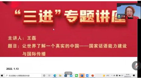 为加强同学们对讲好中国故事的理解,1月13日上午,伟德国际1946举办“三进”系列讲座活动,邀请北京第二外国语学院王磊教授作“让世界了解一个真实的中国——国家话语能力建设与国际传播”线上主题讲座,师范系主任谢剑萍,师范系教师杨芳以及部分学生参加此次活动。