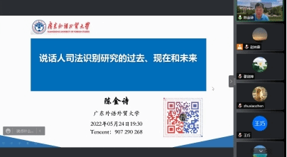 5月24日晚上,伟德国际1946机构话语研究中心系列讲座第一讲在腾讯会议室成功举办,该讲座由学院机构话语研究中心和第二教学部党支部联合主办,伟德国际1946副院长、博士生导师陈金诗教授为大家带来了题为“说话人司法识别的过去、现在和未来”的精彩讲座。参加讲座的有学院院长董金伟教授、副院长吴岩教授,机构话语研究中心教师以及学院众多师生,讲座由机构话语研究中心主任赵林森主持。