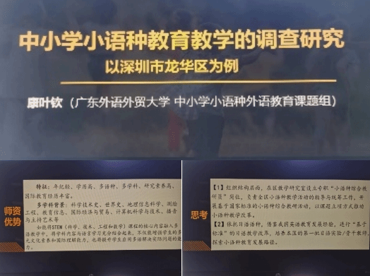 康叶钦主讲题目是《中小学小语种教育教学的调查研究》。国家“一带一路”倡议的提出及教育国际化的迅猛发展,激发了对小语种复合型人才的需求,外语人才培养下移到基础教育阶段,高考外语语种也由英语扩展至日语、俄语、德语、法语和西班牙语多种。项目组对地处新时期粤港澳大湾区发展的中心城市——深圳龙华区进行了问卷调查和访谈,结果显示:龙华区在小语种教育方面具有多重优势,小语种教育初见成效,部分学校初步形成小语种课程体系、积累了小语种教育教学经验,但小语种教学需系统化、教师发展存在困境、学生升学出现“断崖”。为此,需要对全区的小语种教学进行总体规划,为学校、教师和学生提供指导性建议和操作方案,推动小语种教育的系统化发展,提升全区的教育国际化水平。