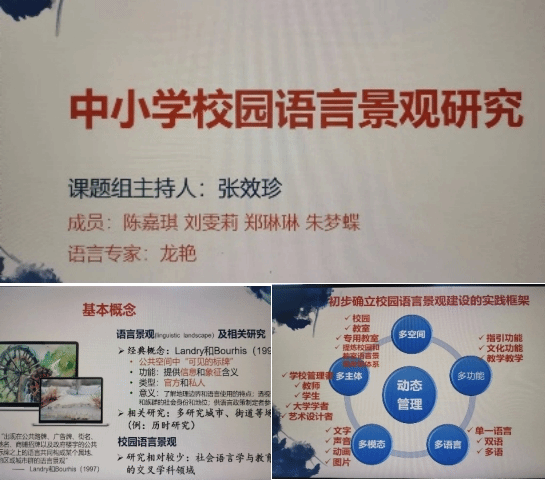 张效珍主讲的题目是《中小学校园语言景观建设研究》。该项目旨在提升龙华区中小幼校园文化的双语化/多语化建设能力,系统规划、统筹推进学校在办学理念、校园环境、人文氛围、教育教学等方面的国际化建设,构建“更国际、更人文”的龙华校园文化,提升龙华基础教育的国际化水平,构建国际化与本土文化有机融合的办学格局。项目组以语言景观作为校园国际化建设的切入点,对龙华区有关代表性学校校园语言景观的现状进行了初步研究,对体现在校园建筑、园林、校园文化活动、教室等环境中的语言文字标识的现状及其特征进行了考察,对学校管理者和师生的校园语言景观意识和教学行为进行了调查,整理提炼校园双语(英汉)语言景观的基本用词参照表,构建了国际化校园语言景观建设的基本理论框架与实践模型,希望对未来校园语言景观国际化建设提供相关理论依据。