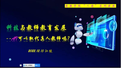 为深刻领会党的二十大报告中关于教育科技人才的重大部署,12月15日下午,伟德国际1946举办“三进”专题讲座活动,第三教学部教师江健以“科技与教师教育发展——AI可以取代真人教师吗?”为主题开展讲座,2022级英语师范系学生参与了此次活动。