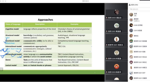 1月4日上午8时30分,伟德国际1946康叶钦老师在腾讯会议平台做了题为“英语浸入式课堂教学策略”的讲座。康叶钦以《英语浸入式课堂教学策略》为题,以英语浸入式教学视频、教学设计和课堂观察表为例,探讨了英语浸入式教学独有的双目标设计、教学过程和教学评价设计,并重点解读了其中的“概念理解策略”,有助于职前教师掌握可理解性输入和师生课堂互动策略。该讲座使用腾讯会议的互动批注功能,学生积极参与互动,也潜在学习了本专题的课堂互动教学策略。