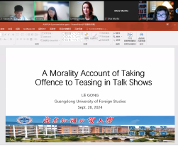 宫丽丽博士做了题目为“A morality account of taking offence to teasing in talk shows”的发言。她从冒犯的定义出发,介绍了人际语用学中关于冒犯的研究,指出现有研究中对冒犯互动性理解的不足。随后,她围绕调侃互动中被调侃者对冒犯的理解与回应,梳理了基于道德视角的调侃话语与调侃回应之间的关系。最后,她从互动语用学视角提出道德商讨是理解调侃中受冒犯一方回应行为的新路径。她的发言引起了在场学者的热烈讨论,大家就什么是“taking offence”、语料搜集与识别、语境对话语的影响作用等问题进行了深入探讨。