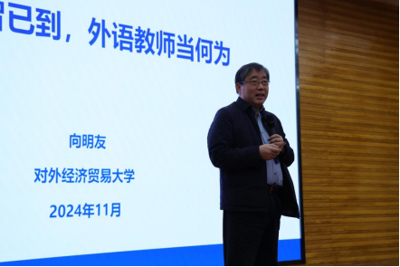 对外经济贸易大学向明友教授针对日益发展的AI技术,提出了“数智已到,外语教师当何为?”的发问,引发了在场教师和学生的广泛思考。向明友梳理了大学外语的本质属性和教育目标,分析数智时代对外语教学带来的变革,深入探讨在数字化和智能化时代背景下高校外语教师的应有作为。向明友的报告帮助高校外语教师在数智时代中找到了自己的定位,他同时强调高校教师应不断学习和创新以适应时代变化,并坚守教育的本质,培养更多适应社会需求的外语人才。