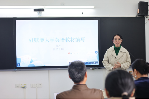 第二教学部党支部书记曾丹作为第二讲主讲人,以“课程思政与教材共建——智能技术赋能教材体系建设”为题,在教材编写方面分享了自己丰富的经验,尤其强调了在使用AI技术的尝试与体会。她详细介绍了AI在教材编纂中的应用,包括自动目录生成、高效寻找阅读材料、识别并处理敏感内容、修改材料以增强多样性和呈现方式的创新等。同时,她也指出了当前AI技术在某些练习类型,如阅读理解题目的局限性,并强调了结合使用多种AI工具的重要性。她同时指出技术应用的边界:“AI对开放式阅读理解题的设计仍存在局限,需结合教师经验进行二次优化。未来的教材编写将是‘人机协作共创’的智能模式。”此外,她讨论了AI技术如何在提高教育效率和促进学生AI素养方面发挥作用,表达了对AI未来在教育领域应用的乐观态度。她的发言涵盖了AI技术在教育中的多个方面,从内容创造到教学方法的创新,展现了她对技术如何重塑教育的深刻洞察和积极展望。