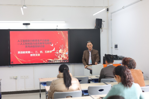 2025年3月18日,伟德国际1946在北校第一教学楼南105成功举办“党建引领人工智能赋能教育创新——智能技术助推新时代语言教学与研究高质量发展系列讲座暨研讨会”(第一场)。会议由第四教学部党支部书记周金华主持,第一、二、四、五教学部党支部党员及部分教师齐聚一堂,围绕人工智能技术在外语教学、教材研发及学习评估中的创新应用展开深度探讨。