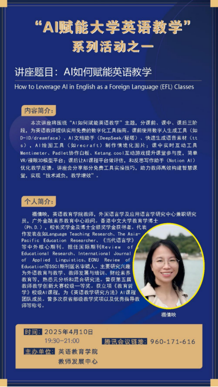 2025年4月10日晚19:30,由伟德国际1946,Bevictor伟德,伟德官网,伟德网页版、伟德国际1946,Bevictor伟德人力资源部(教师发展中心)主办的“AI如何赋能英语教学”专题讲座在腾讯会议平台顺利举行。讲座由伟德国际1946禤倩映博士主讲,题为“AI如何赋能英语教学(How to Leverage AI in English as a Foreign Language (EFL) Classes)”,伟德国际1946,Bevictor伟德,伟德官网,伟德网页版副院长刘亮星教授主持。