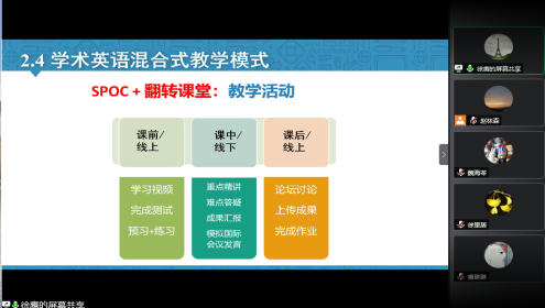 讲座问答环节中,院长董金伟教授做了精彩的点评,鼓励大家学习华工在学术英语教改方面的先进经验,引以为鉴,结合学院自身的资源优势和特色,积极推进我校的大学英语教学改革。董院长还对疫情期间学院教学的平稳运行给予了高度肯定,并鼓励各个教学部继续开展多样化的教研活动。讲座最后,徐鹰教授与在线教师进行互动,答疑解惑、交流感悟,讲座现场气氛热烈。