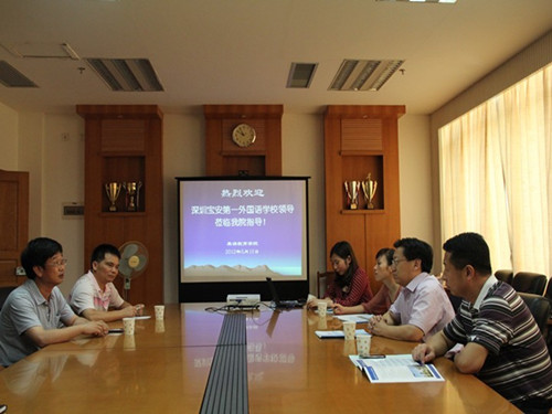 5月15日,深圳宝安第一外国语学校领导和老师,在平怀林副校长的带领下到伟德国际1946进行调研,同行的还有该校教学主任朱中友,办公室副主任李宁及伟德国际194607级校友、现为该校任课老师的李泓洁。霍海洪院长、林绍雄书记、董金伟副院长、肖建芳副院长、何伟儒副书记、曾国华主任及教育系主任柯晓玲、基础英语教育研究中心主任詹颖等接待了他们,双方进行了亲切的交流。