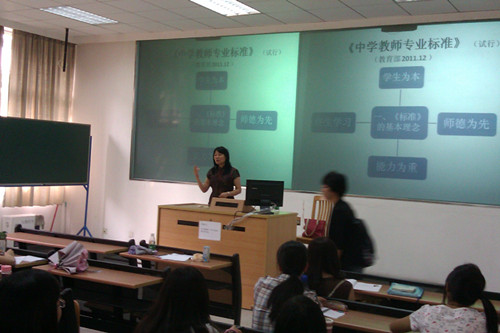 围绕“中学英语教师应具备的素质”这个主题,李华教授对国家教育部2011年12月颁布的《中学教师专业标准(试行)》(以下简称《标准》)展开阐述,给同学们进行了持续2.5小时的培训。