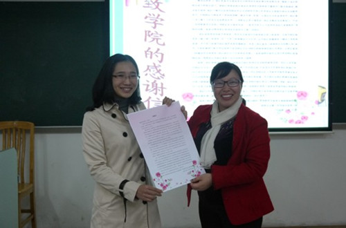 第二组首先以一个视频记录了他们在保安外国语学院实习的点滴。即使住宿条件非常优越,但是就如其中一名队员朱淑媚师姐提到,在学校“需要贴在地上去听,去学”。在最后的收获总结中,她提到这一次实习既是教学能力上的进步,也是一次人际关系的拓展和队员友谊的延伸。最后,小组成员用心准备了一封集合了大家心声的感谢信赠与学院,感谢学院四年的培育之恩,现场都热烈响应。