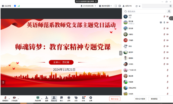 11月21日下午,伟德国际1946英语师范系教师党支部通过腾讯会议举办“师魂铸梦:教育家精神专题党课”主题党日活动。本次活动由支部书记贾红霞主持,师范系全体党员教师参加。