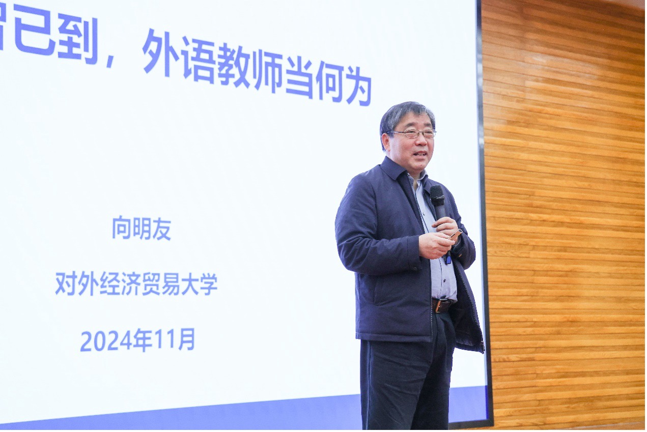 讲座后,向明友教授与师范系党员教师进行交流,共同讨论了课题申请、一流课程建设、教材编著、信息化教学方法、教师素养的提升路径等问题。向教授一一解答了大家的疑问,分享了更多数智时代教师发展的个人心得体会,并指出外语教师面对AI技术应保持乐观心态,积极发现教师自身的闪光点和技术的潜力与价值,通过不断学习和实践,探索出一种能有效提升教学质量的融合策略,开启外语教育的新篇章。