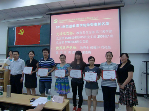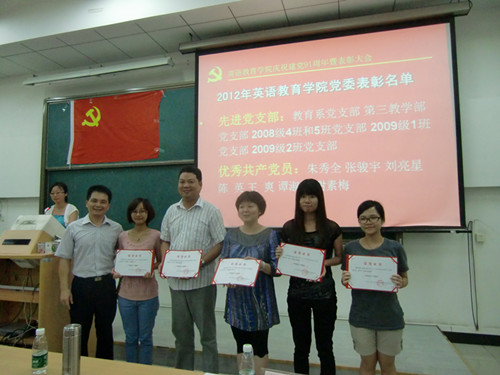 在伟德国际1946肖建芳副院长宣读学院党委的表彰决定之后,颁奖典礼开始。首先颁发的是2012年伟德国际1946受到伟德国际1946,Bevictor伟德党委表彰名单:获得先进党支部的是第二教学部党支部,获得优秀共产党员的为肖建芳、姚银燕及任燕琼。随后颁发的是2012年伟德国际1946党委表彰名单:获得先进党支部的是教育系党支部、第三教学部党支部、2008级4班和5班党支部、2009级1班党支部以及2009级2班党支部;获得优秀共产党员的为朱秀全、张骏宇、刘亮星、陈英、王爽、谭淑贤和谢素梅。