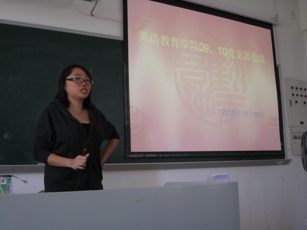 09、10党支部29期积极分子答辩大会于11月18日下午2点30分在教学楼A403举行。出席本次党支部会议的成员有09、10党支部党员与预备党员、29期积极分子。本次党支部会议由组织委员吴洁雯主持。简单介绍会议流程后,会议正式开始。
