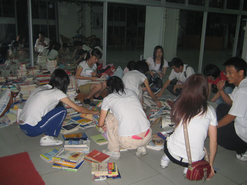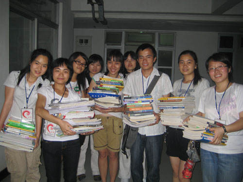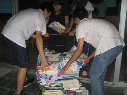 很快,收集的书就屯成了一堆堆。同学们开始进行整理分类:杂志﹑课本﹑考试辅导用书等等。他们用红绳把整理分类好的书籍绑成了一捆捆。望着这些书,同学们脸上都绽开了笑容。