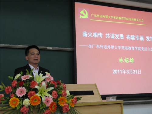 随后,学院党委书记林绍雄向大会作了题为《薪火相传,共谋发展,构建幸福 ,发挥作用》的工作报告。报告共分为三个部分,分别就学院党委过去三年的工作中所取得的成绩进行了回顾,对过去三年获得的经验与存在的不足进行了分析,并对今后几年的工作提出了若干设想和部署。过去的三年间,学院党委围绕学校和学院的中心任务,积极抓好学院的政治、思想、组织、作风、制度、文化等方面建设,充分发挥党组织的政治核心作用和党员的先锋模范作用,为学院的和谐、科学发展营造了良好的氛围,提供了强有力的思想政治保障。今后几年,学院党委将继续加强党组织和党员队伍建设,实施固本强基工程;加强领导班子和干部队伍建设,实施素质提升工程;加强规章制度建设,实施规范强化工程;加强宣传思想政治建设,实施灵魂铸造工程;加强学院精神家园建设,实施幸福构建工程;加强群众组织建设,实施人心凝聚工程,在推动学院科学发展、和谐幸福的历史进程中发挥更加重要的作用。大会号召全院各级党组织和师生特别是共产党员继续解放思想、坚定信心、与时俱进、开拓创新、振奋精神、创先争优,共同为实现学校、学院“十二五”发展目标和“十年腾飞”而努力奋斗!林绍雄同志的工作报告博得了与会党员同志的阵阵掌声,并在大家的热烈掌声中获得通过。