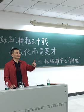 作为一名入党满30年的优秀党员,林绍雄在本次讲座中与同学们亲切分享了自己的入党经历,从小以父亲为榜样的他,在父亲的影响下,早早地在心里无声埋下了爱党爱国的种子。他说道:“入学后,学的第一句话便是‘毛主席万岁,共产党万岁’。”小小年纪虽不能领会其意,却也能感受到其中无限的神圣感。入学后,他不仅努力学习,成绩一直保持名列前茅,课余时间更是勤奋劳动,与小伙伴们捡麦穗、挑担子,保持着强烈的劳动观念,在学习和生活中都秉持勤恳务实的态度。其中最为令人印象深刻的还是他高度的思想觉悟,无论是加入少先队(时称“红小兵”),加入共青团,还是加入中国共产党,他总是第一批积极提交申请,由于各方面表现优秀,也几乎总是全校第一批通过申请的。在学生时代,林绍雄积极担任班委和级委,工作后他长期在团委、党委从事工作,一直身先士卒,为同学、为人民服务,认真负责的态度和积极乐观的精神也得到了身边同事、师生和领导的好评。在活动的最后,林绍雄以自己的亲身经历告诫大家,“做人要有目标,有追求,并且为之努力,让自己成为一个有价值的、被需要的人;做事要高标准严要求,既要雷厉风行,也要细致耐心;待人要热情、友善、互助,作为英教专业的学生,日后成为老师也要言传身教,潜移默化给学生以好的影响。”