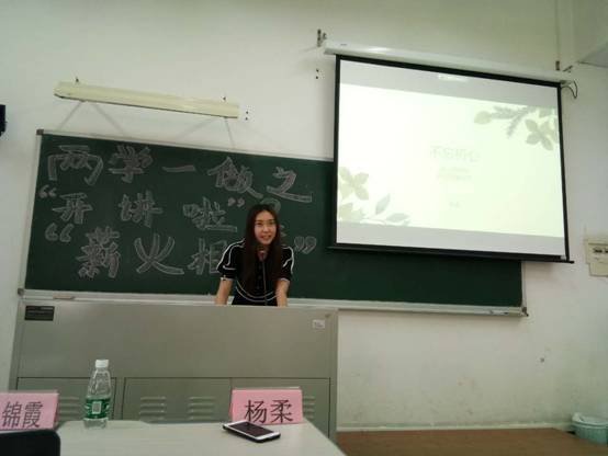 马上就要毕业走上工作岗位的2013级朱锦霞则为大家分享了关于“梦想与担当”的话题,她以自己的追梦历程向现场的师弟师妹们传达了一个可贵的忠告,那就是在追梦的路途中前行,需要有坚定的信念、扎实的实力和基本的职业操守。同时,她向所有在场的师弟师妹们提出了殷切的期盼,希望大家都能把握机会,珍惜学校和学院所提供的资源。朱锦霞以自己的切身经历提醒大家,不管是机会还是资源都是需要自己去发现,去争取的。平时学院和学校给了大家很多机会和资源,如果平时不多加留意并主动争取的话,便会白白错过,空留遗憾。比如招聘信息这一块,每一年学校都会举办多场招聘会满足学生的需要,学院的领导和老师也经常会向学生们发布一些不错的招聘信息,只要好好把握,便不会为资源稀缺而发愁。她还跟大家分享了她实习教学时的一些经验教训,她告诉我们不管做任何的事情,都要注重细节。最后,她还跟师弟师妹们共享了精心整理的学习资料,让大家受益匪浅。