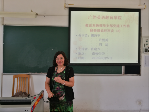从2017年9月教育系党支部开始举办党建工作坊系列:“爸爸妈妈好声音”活动以来,该活动受到了教育学院老师们尤其是党员老师们的积极响应和热烈欢迎。本着基层党组织要为群众服好务的宗旨,实现“筑小家,建强国”的美好愿景,2018年9月27日下午3点30分,伟德国际1946教育系党支部在南校区G105课室举办党建工作坊系列:“爸爸妈妈好声音之三”育儿经验专题分享活动。教育系 教工党支部书记肖建芳老师主持了本次活动,魏海苓老师、许悦婷老师和周洁老师做了分享发言。