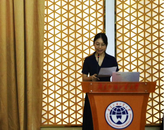 教育系副主任陈媛媛作为教师代表发言。首先,她代表教育系热烈祝贺新生考入广外,进入英教大家庭,开启人生新篇章。她就新生们肩负的新责任,新使命,结合人工智能时代中教师行业的新挑战展开讲话。她指出,每一个人都有权利,也有责任做到心怀远大理想,走在世界的前沿,在遇到困难时,要坚定信念,不急躁,不畏难,应该拥有博大的胸怀与宽广的视野,为成为有专长又博雅的现代化人才而奋斗。最后,陈媛媛祝愿新生们蓬勃成长,不负此行。