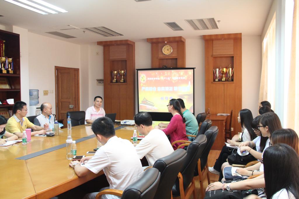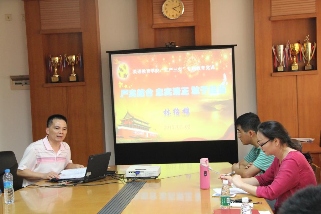 2015年7月2日下午,伟德国际1946党委在南校区院系办公楼245会议室召开以“严实结合忠实清正敢于担当”为主题的伟德国际1946“三严三实”专题教育党课。党课由学院党委书记林绍雄主讲,学院领导、系部主任、教工党支部书记及委员、学生党支部书记以及党建小组负责人参加了党课。