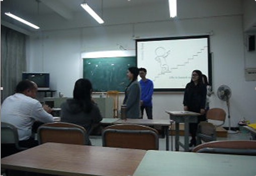 再看看,精妙的presentation仍在炫丽展现。由大一学生龙方威、罗彤,大二学生汪延曦、欧阳晓茵组成的四朵金花组的表现顿时令人眼前一亮。他们以情景剧的形式向评委展现一幕完整的心理故事,欧阳晓茵准确的发音,跌宕起伏的音调,恰到好处地表现出了情景剧中女主人公的心情起伏。扮演心理医生的汪延曦,听到女主人公诉说自己弱况的那一瞬,拍桌而起,说辞铮铮有力,强调适当运动可以减缓压力,体现了她的强大气场和良好台风。表演以一小段充满活力的舞蹈结束,体现的是欢乐的结果,正确缓解了压力。