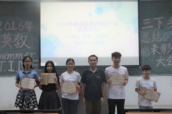 最后是激动人心的颁奖仪式。清远英德大湾队获得优秀队伍称号,徐昶斌为他们颁奖。林泽龙为获得优秀队员称号的同学颁奖,他们是刘雁珊,张睿,何莉怡,吴泽佳和朱美芳。颁奖仪式后,优秀队员朱美芳进行了发言,分享了自己在大湾队这15天的心路历程。