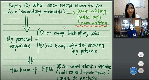 我也很推荐大家去选工作坊这类人数较少的课堂。我选了一门叫做“Essayism”的课堂大约只有12人左右,所以这门课的师生交流量非常大。学生组成也很复杂,一起上课的有接受家庭教育的高中生,哥大本科生、研究生和博士生,不同年级的学生带来了不同的视野与观点角度。讨论过程中,任何人都可以提出一个自己感兴趣的议题,教授会将其延展并让此议题变得更有讨论性。教授也非常善于利用多媒体增强网课的合作性,比如她会很细致地把发言人的观点打在交流栏里,以方便其他同学们回顾。因此在这节课里我不仅学到了essay这一文体的发展史,还学了不少教学技能。