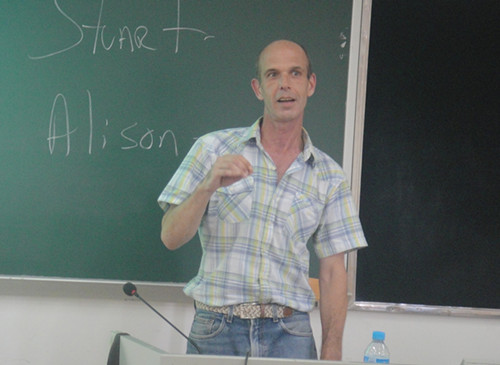 在两位主讲人轻松诙谐的自我介绍后,讲座正式开始。首先,Stuwart引用弗洛伊德的名言“Words and Magic were in the beginning one in the same thing, and even today words retain much of their magical power.”来展现语言文化的神奇魅力,引人入胜。接着,Stuwart和程成联袂开讲,由传统语言模型联系到语言学习心理架构上,从对第二语言习得中的社会和情感因素的深刻剖析,自然地推出“SLA是认知心理学除了语言学的一部分”和“SLA是一个过程,更多的是最终结果”等观点。讲座最后,他们通过组织两个小型讨论活动来加深同学们对中西文化背景对语言学习影响的理解。Stuwart还谦虚地请教中国学生的学习方式和习惯。互动环节中,全场气氛热烈,同学们踊跃回答问题,争相分享经验和见解。