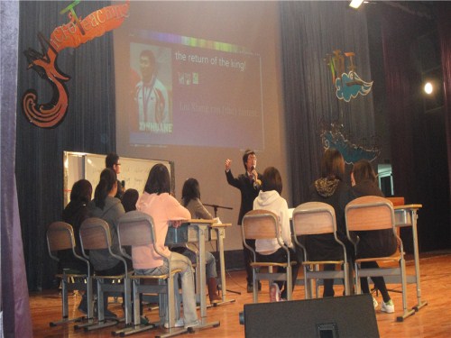 第一个上场的队伍Break It是两位气宇轩昂的男“老师”。他们通过展示“亚运之最”的图片,如最动人的瞬间、跑得最快的运动员等引出教学内容——最高级。而他们精心配音的蜡笔小新视频更是把亚运和最高级的知识完美地结合在一起,让枯燥的语法课堂变得趣味盎然。