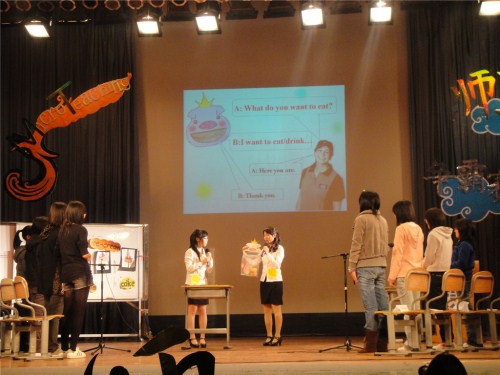 最后上场的是“Follow Me”组合。她们以实用的问路用语为教学内容,结合听力、情景问答等形式充分调动了学生的积极性。在教学过程中,其中一名队员在众人惊叹的目光中变身为一名问路的外国女士,让学生更加身临其境地进行实战操练。整体而言,“Follow Me”队配合默契,教学环节设计流畅,这成为了她们的教学展示的一大优势。