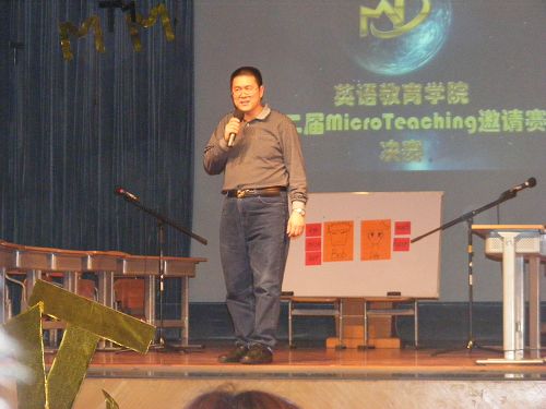 On the eve of March 20th, The Second Microteaching Final Contest, which was held by the Faculty of English Education, took place in B8. Dean Zhou Fuqiang, subaltern SEC Yi zongyong, Director Zhoujie,Counsellor Jiangjian and Dr. Ed Nicholson were present. Many teachers as Gu Keping, Liyue, Yang Manzhen, and Huanghui acted as judges for the contest.