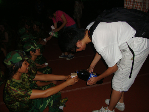 首先,团学各部门部长对新生进行了自我介绍和部门介绍。他们的用语或简洁生动或幽默活泼,用别具一格的方式将自己所代表的部门的独特面貌展示在新生面前,使新生对团学各部门的工作及其特色有了进一步的了解。他们精彩的表现也引来新生阵阵热烈的掌声和欢笑声,使训练现场的气氛变得轻松活跃起来。同时,团学成员不仅贴心地为新生送上饮料,带去一丝清凉与甘甜,而且用自己的歌声为他们驱散训练的疲惫,让新生在紧张的训练之余得以放松片刻。