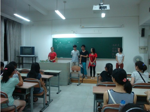 在新生们的自我介绍中,1301班同学们的才艺表演令人为之一叹,同学们可谓是多才多艺。“数风流人物,还看今朝。”其中一位女同学的才艺可谓是令人叹为观止,拥有一副好嗓音的她,为同学们唱了一段感人动听的潮剧。在座的同学们也许听不懂内容,却被她美丽的歌声吸引着,仔细地聆听着。