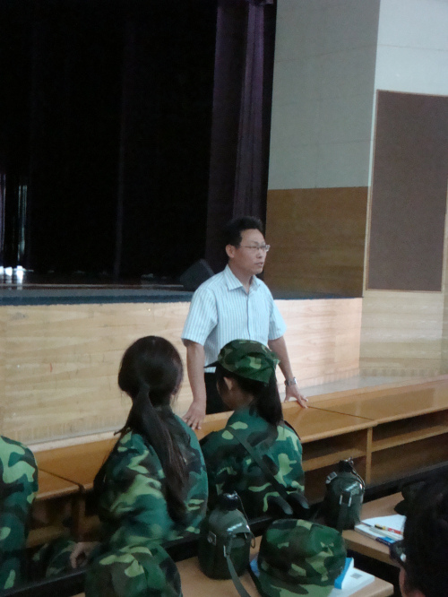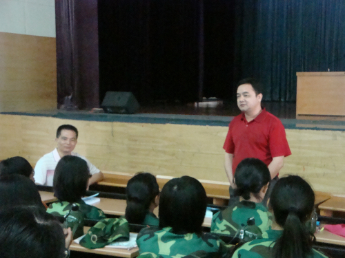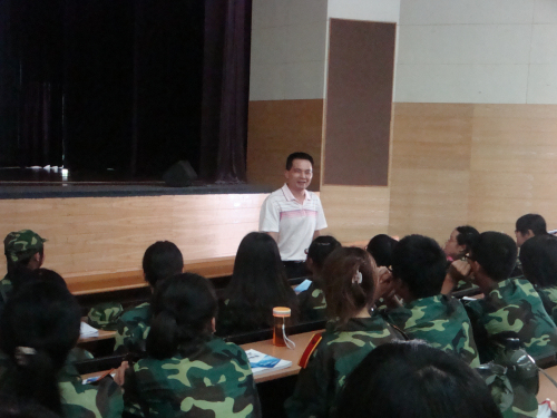 董金伟院长首先代表学院预祝新生们中秋快乐,说在军训中与来自五湖四海的新同学们一起过中秋使佳节更显特别,学院也在这特别的节日里为大家送来饭票与清凉饮料,“让大家加加餐”,让大家感受到英教大家庭的温暖。随后董院长更详尽地跟新生谈起了英教专业的优势,英教专业的针对性强,而“英语强,教育好”的特色更使课程设置上与港澳接轨,英教学子也有更多境外交流的机会。