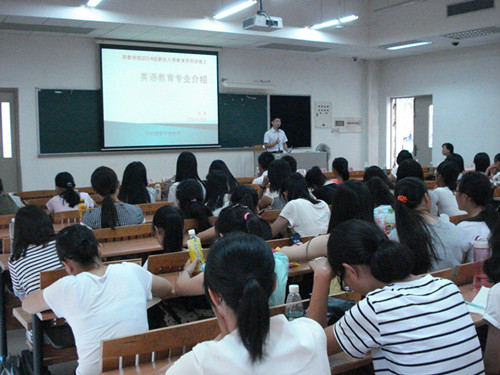 在开学典礼的最后,熊涛老师进行了英语教育专业介绍,他以“IQ与EQ并行”的话题引入讲解大学四年要如何度过,然后详细介绍了英语教育专业以及课程的设置,其中包括学院办学特色、培养目标等。熊涛老师指出,广外的英语教育专业是一门让人成为“好老师”的专业。另外他还介绍了丰富多彩的校园生活和我们学院的品牌活动比赛等。最后他通过介绍英语教育专业的高度社会认可度寄予2014级新生们奋发前进的希望。
