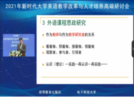 华南农业大学外国语学院院长、《中国外语》杂志主编黄国文以《从外语课程思政建设到外语课程思政研究》为题,分析了当前我国大学英语教学改革所处的新时代,出现的新动向及面临的新挑战。重庆大学外国语学院教授余渭深指出,大学英语从教学范式向学习范式的转型体现了新时代大学英语教学改革的根本转变,在学分减少的情况下大学英语应坚持能力优先、成果导向。华北电力大学外国语学院副教授武艳结合《新时代明德大学英语》的试用体验,介绍了如何在教学中融入思政元素。