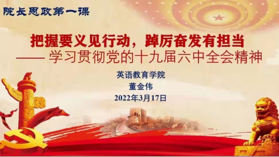 3月17日下午,伟德国际1946线上举办院长思政第一课,学习贯彻党的十九届六中全会精神,学院院长董金伟为2020级英教学子作“把握要义见行动,踔厉奋发有担当”主题讲座。