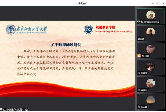 学院党委书记林绍雄就疫情防控工作和师德师风建设进行了专题教育和部署。对于疫情防控相关工作,他细致说明了师生健康监测、考勤登记、核酸检测、外出报备和返校防控等具体要求,强调疫情形势复杂多变,校园暴发聚集性疫情的风险持续升高,大家要认真学习贯彻上级关于疫情防控工作的重要指示精神,坚持科学精准、以人为本,巩固防线、堵塞漏洞,织密织牢校园疫情防控网,坚决维护师生生命安全和身体健康。在师德师风警示教育方面,林绍雄通报了教育部近期公开曝光的7起违反教师职业行为十项准则的处理案例,对涉及的性骚扰、廉洁纪律、有偿补课、教师资格证造假、体罚学生、发表错误言论等问题进行分析和警示教育,希望学院教师对师德失范行为引以为戒,严格贯彻落实党中央关于教师思想政治和师德师风建设工作的决策部署,做到警钟长鸣,切实增强遵守教育法规和教师职业行为十项准则的思想自觉和行动自觉,深刻认识教师肩负的光荣职责和神圣使命,坚守为党育人、为国育才的初心,不断涵养自己的高尚师德,以德施教、以德育德,做党和人民满意的“四有”好老师。
