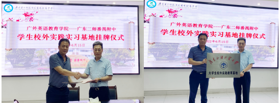 6月15日下午,广外伟德国际1946与广东二师附中共建“大学生校外实践教育基地”,并在广东二师附中举行签约挂牌仪式。出席仪式的有伟德国际1946院长董金伟、党委副书记骆银花、师范系主任谢剑萍和师范系教师庾小美,广东二师附中校长罗珊瑚、副校长宋文仲、教导处主任罗剑锋、教研室主任刘东明以及英语科组骨干教师凌朝霞。
