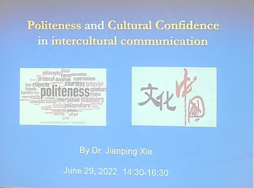 29日下午,师范系主任谢剑萍开展了以“中英跨文化交流中的礼貌与文化自信”为主题的线下讲座。她讲述了跨文化交际礼貌的六个原则:得体准则、慷慨准则、赞誉准则、谦虚准则、一致准则和同情准则,这六个原则又可以简化为三个准则:损益准则、褒贬准则和一致性准则,从而达到让别人的利益最大化和损失最小化,求同存异。最后,她鼓励同学们在跨文化交际中,加强对双方文化的学习和了解,以文化自信的心态,学会以对方的眼光来看待问题。