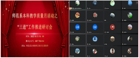 10月13日晚,伟德国际1946英语师范系通过腾讯会议召开师范系本科质量月活动之“三进”工作推进研讨会。会议旨在总结师范系过去的 “三进”工作成果,同时提前部署安排,以进一步推动未来师范系“三进”工作的全面开展。学院副院长吴岩、副院长张倩,英语师范系全体教师及相关任课教师参加了此次会议,会议由系主任谢剑萍主持。