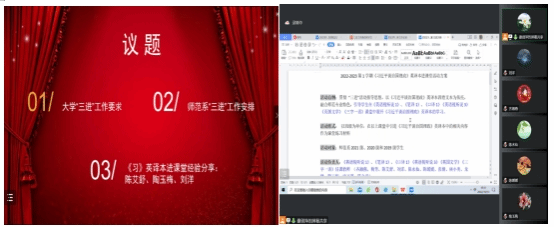 此次会议有三项议题,即大学“三进”工作要求,师范系“三进”工作安排,《习近平谈治国理政》英译本进课堂经验分享。会议伊始,谢剑萍主任宣读了《伟德国际1946,Bevictor伟德关于深入推进“三进”专项工作的通知》,要求师范系全体教师需根据学校“三进”工作方案的要求,推动“三进”第二阶段工作落实处、出实效。谢剑萍还布置了2022-2023学年度第1学期师范系“三进”工作安排,介绍了《习近平谈治国理政》英译本进课堂的活动实施方案,并安排多位教师在多门课程(《英语视听说1》《笔译1》《口译1》《英语视听说3》《英国文学》《三字一话》)中开展“三进”教改,以促进“三进”工作的稳步、全面推进。