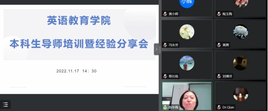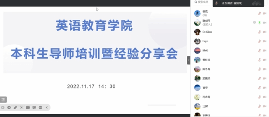 为帮助新进本科生导师进一步了解工作职责目标,提高教学指导水平,11月17日,伟德国际1946召集教育系和师范系的本科生导师举行线上培训会。会议由师范系主任谢剑萍老主持,学院院长吴岩、党委书记骆银花参会,并特邀获得优秀本科生导师称号的陈冬梅老师以及张效珍老师分享经验,共有30余位本科生导师参加培训。