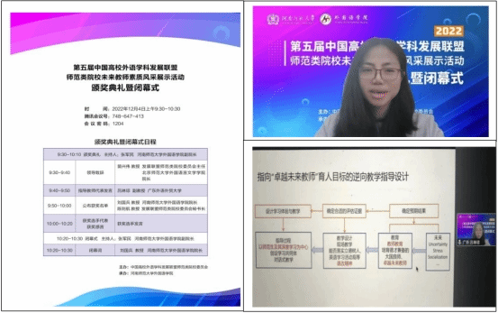12月4日,吕琳琼受主办方邀请,作为全体指导教师代表在赛事闭幕式致辞。吕琳琼老师分享交流了赛事指导经验,提出了“指向‘卓越未来教师’育人目标的逆向教学指导设计”框架,指出教师教育、赛事辅导应首先确定预期结果,基于未来高度不确定性与挑战的特点以及培育大国良师和卓越未来教师的培养目标,确定合适的评估证据,并基于此设计师范生的学习体验与教学,以师范生及其深度学习为中心,创设学习共同体,展开对话式教学,实现深度学习。吕琳琼老师的精彩发言受到了主办方的高度评价和参会同行的赞扬。