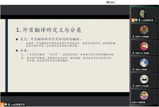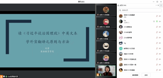 为进一步帮助同学们深刻理解习近平总书记治国理念,并提升翻译实践能力,1月5日下午,伟德国际1946线上开展了《习近平谈治国理政》英译本赏析“三进”专题系列讲座,第四教学部教师刘芳作专题讲座,2021级英语师范系学生参与此次讲座。