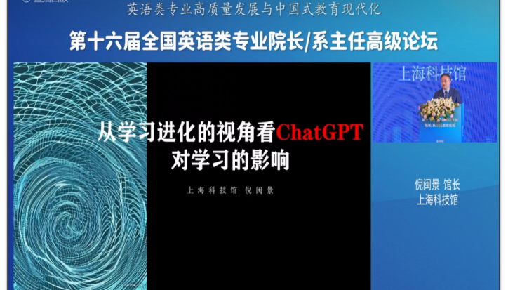 上海科技馆馆长倪闽景在本次论坛作了题为“从学习进化的视角看ChatGPT”对学习的影响”的主旨报告。他梳理了人类社会不同阶段的学习方式,指出当今ChatGPT工具的出现改变了英语学习的方式。他认为拔尖创新人才没有所谓的天选之人,未来有了工具知识支持,只要是智力正常,每个人都可能成为拔尖人才。