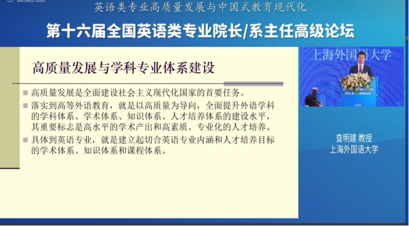 上海外国语大学查明建教授做了“英语专业高质量发展与知识体系、学术体系建设”的主旨报告。他指出英语专业内涵建设应当从“完善英语专业的学术体系、完善英语专业知识体系、健全英语专业的专业方向课程、构建本硕博一体化的课程体系、提升学生的人文学科知识修养、增强学生中国语言文化修养”六个方面进行。