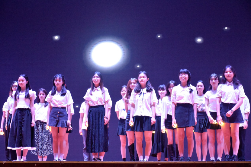 班级合唱《陪你度过漫长岁月》拉开了晚会下半场的帷幕。《传承祝福》、《岁月》、《海阔天空》歌曲节目的精彩展示,歌唱青春的故事与未来的美好畅想,赢得了热烈的掌声。